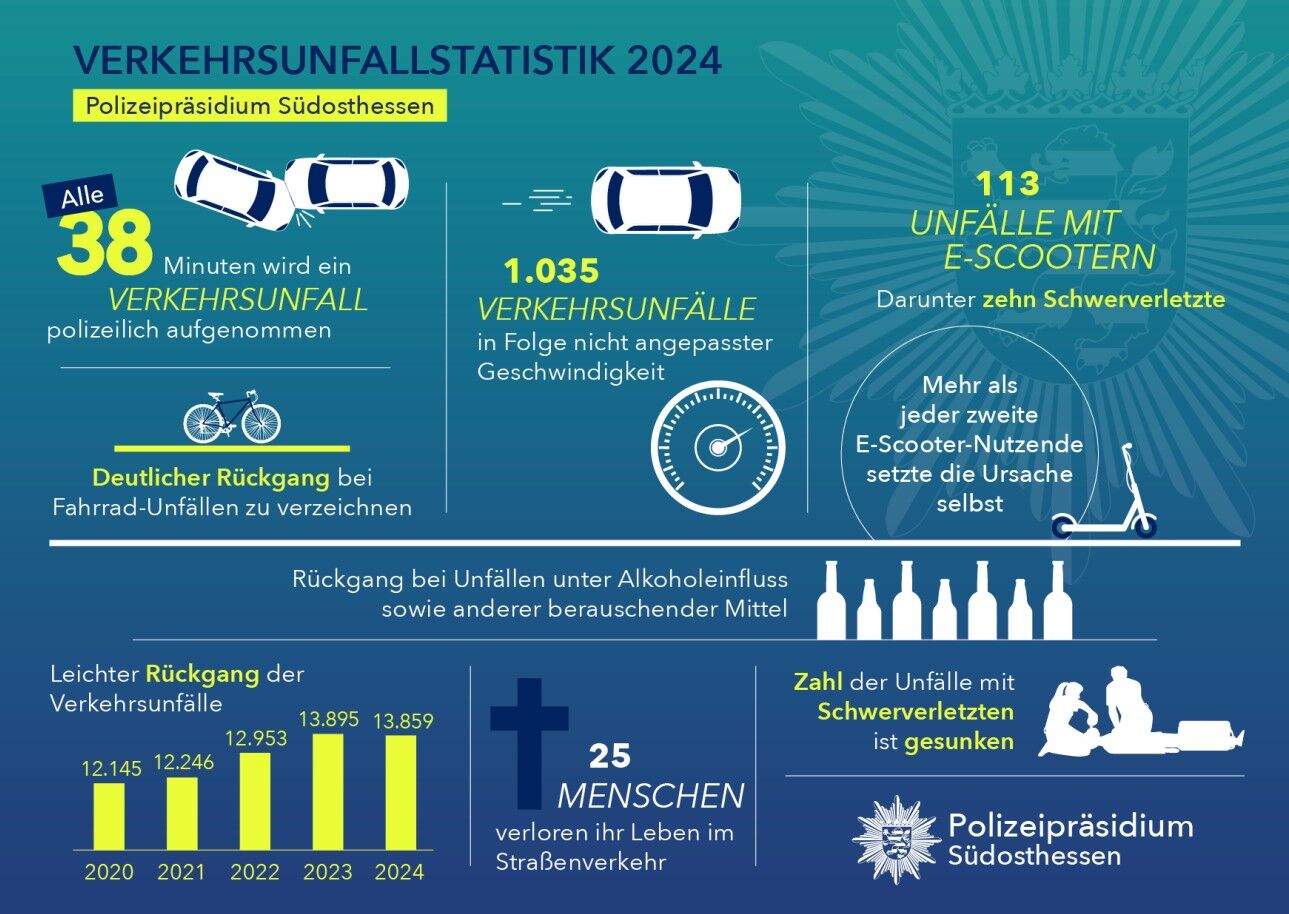Die Zahl der im Jahr 2024 polizeilich aufgenommenen Verkehrsunfälle im Zuständigkeitsbereich des Polizeipräsidiums Südosthessen ist im Vergleich zum Vorjahr erfreulicherweise leicht auf 13.859 gesunken (2023: 13.895).